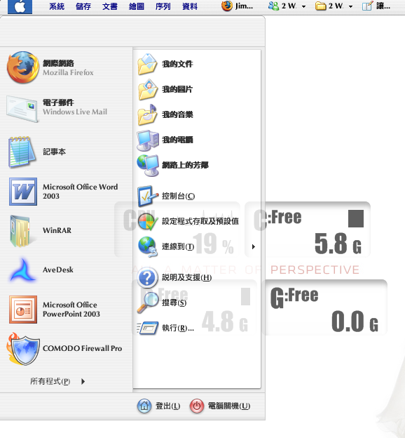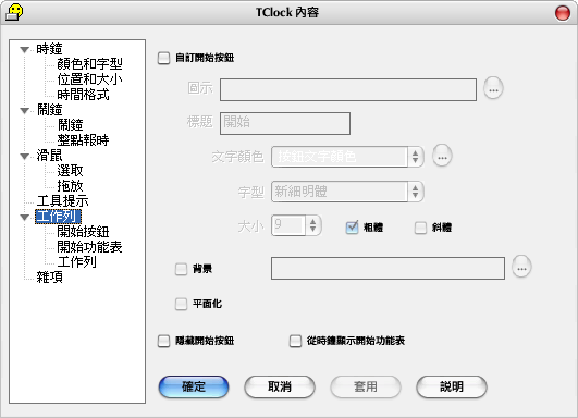 包括了可以設定鬧鐘、滑鼠動作、工具列以及開始功能表透明度等、其中我覺得最特別的是可以自訂開始按鈕,還滿好玩的,大家可以依喜好玩玩看喔。