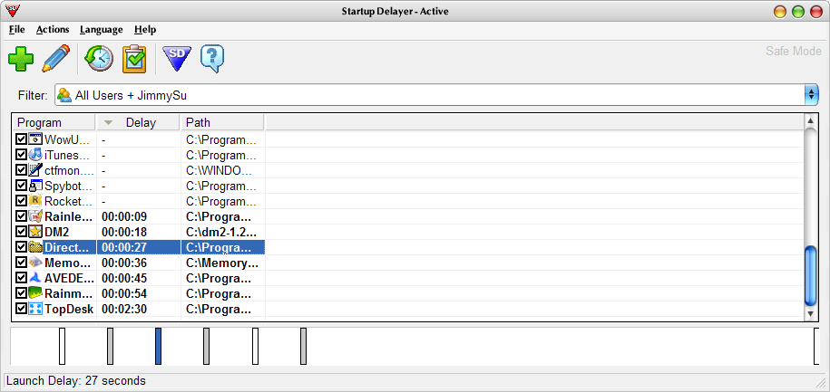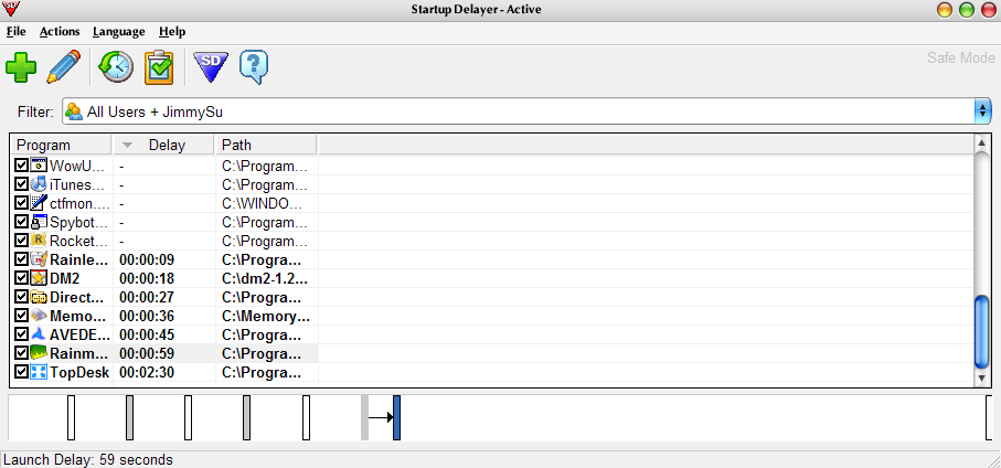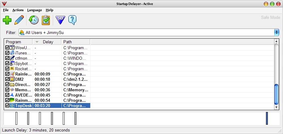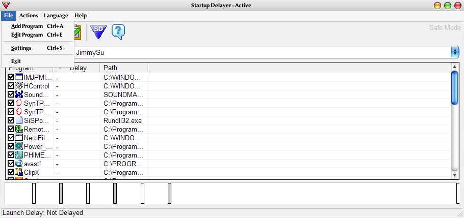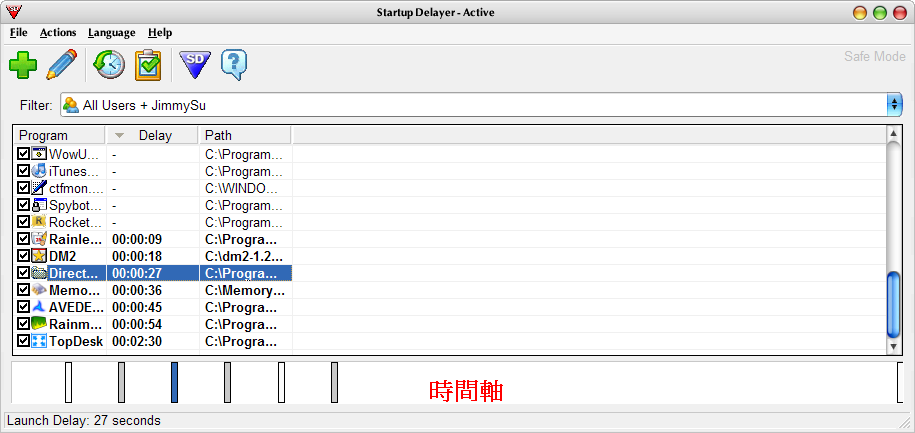 安裝好的 Startup Delayer 剛啟動時,會顯示一些系統設為開機啟動的程式,若清單沒列出來,也可利用 "File -> Add program" 來加入程式執行檔,就會出現在清單了,但是有時候加入程式會出現一個找不到程式的視窗,但是清單還是會出現,可能是個小 BUG 吧? 接著只要把你要進行規劃的程式,往下拖曳到時間軸的位置,就會出現該程式的時間軸記號。
