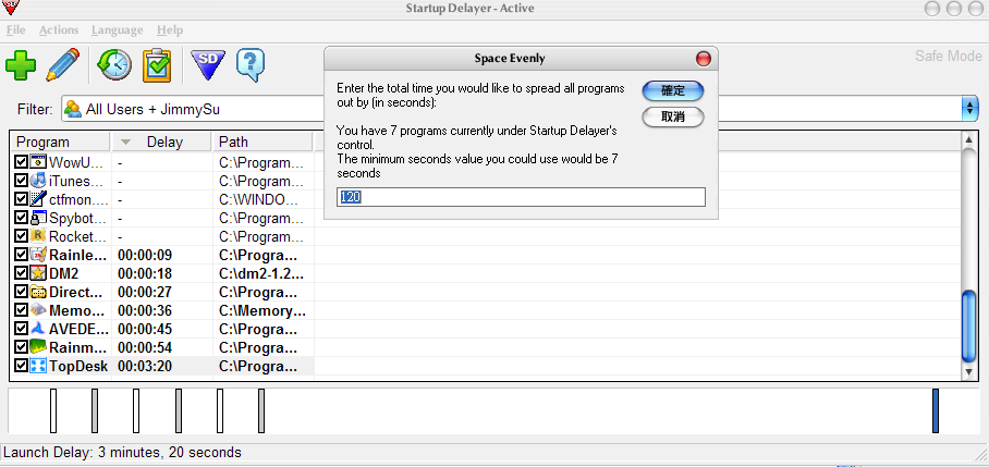 選好程式後,接下來就是要設定開機時間啦,其實設定的方式滿簡單,只要拖曳時間軸上相對應程式的符號到你要的時間點就可以了,當然如果你懶得一個一個程式慢慢調整的話,也可使用 "Action -> Space Evenly" 的功能,輸入一個秒數後會,所選的程式會被平均分配在這個秒數間開啟,譬如說你輸入 120,且指定 3 個程式,則會排成每 40 秒會開啟一個,以此類推,可以省下不少時間。
