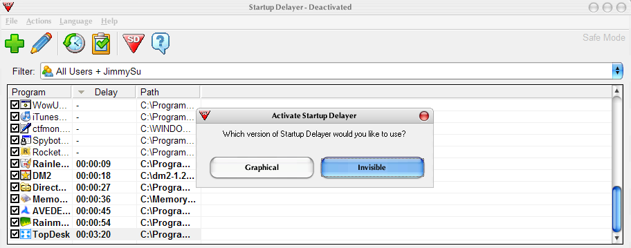 所有設定完成後,記得點一下標有 "SD" 的那個倒三角形符號,這個符號變成藍色以後才算是完成設定,而點這個符號的時候會跑出一個視窗,其中 "Graphical" 代表開機時,會出現一個小視窗來告訴你開到哪個程式了,而 "Invisible" 則是不會出現提示,就看需要設定嚕。