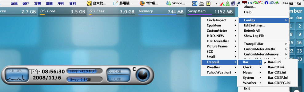 接下來就來說明用法吧,安裝完成以後,就可以開始開啟桌面小工具啦,開啟方法為 "對 rainmeter 系統圖示 (小水滴) 按右鍵->Configs->選擇你要的工具"。