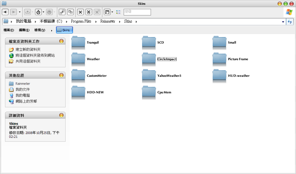 而安裝新面板的方法跟 Rainlendar 差不多,先把下載下來的檔案解壓縮以後,直接把整個目錄丟到 Rainmeter 的 Skins 資料夾下就好啦。