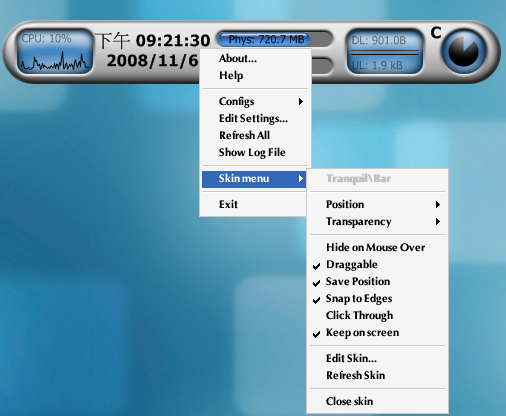 接著就可以慢慢加入你要的功能啦,加入之後,可以對新增的小工具按下右鍵,可以在 "Skin menu" 下對它們做一些設定。
