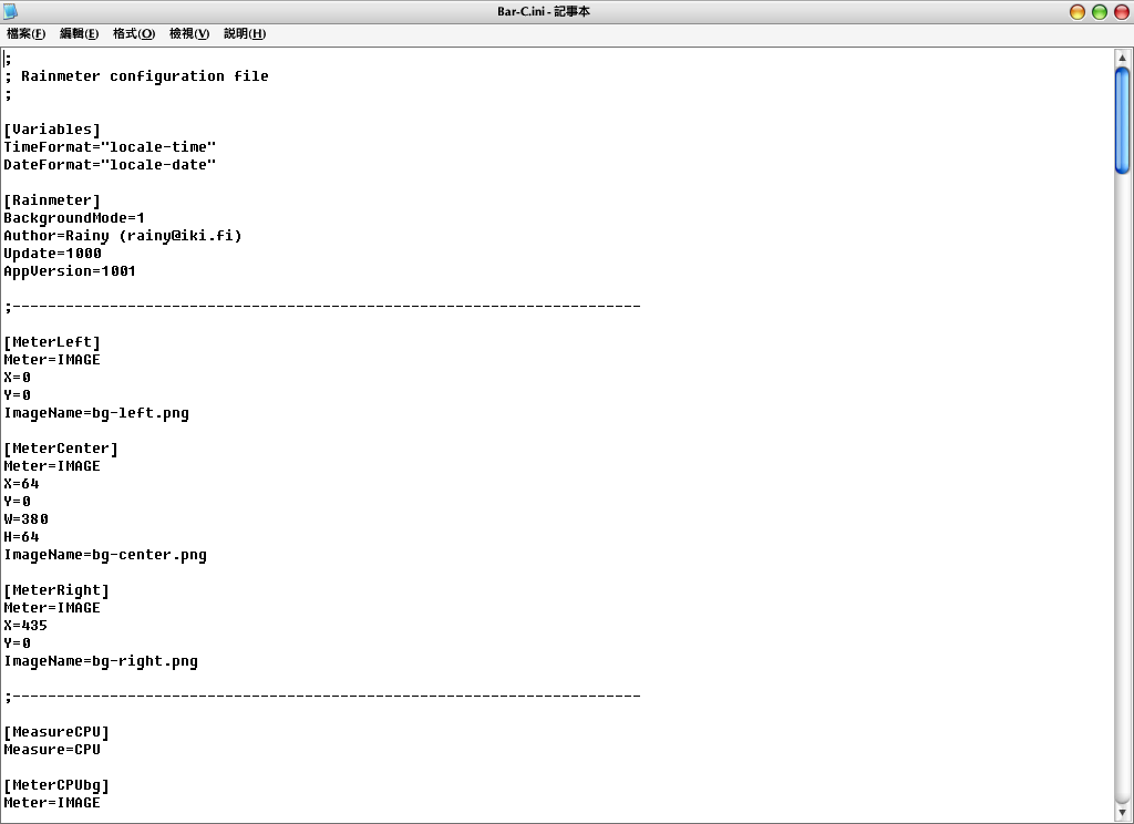 Edit Skin:這項功能是用來針對一些工具面板微調使用的,選取之後會出現一個記事本檔,也就是開啟該面板的 ini 檔案 (在各個面版的資料夾下也找的到),可以做一些面板的編輯,像是改變字體、天氣面板改變都市、偵測 C 槽的小工具改成偵測其它位置等,它的排列方式有點像是程式語法,以硬碟空間的小工具為例,其實只要把本來的有關 "C:\" 的指令改成其它你要的槽就可以啦,其實並不太難,可以玩玩看,不過記得把原始 ini 檔備份唷。編輯好存檔以後,按一下 "Refresh Skin" 後,剛剛的修改才會生效喔。