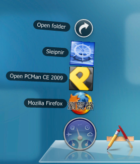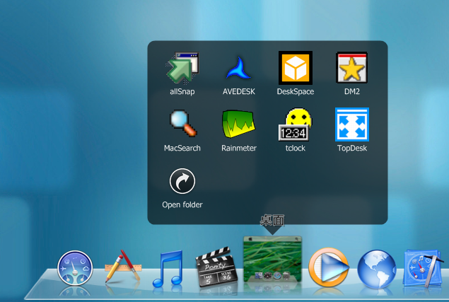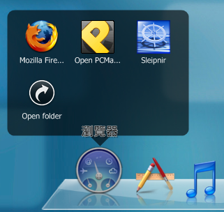 這個部份可以先閱讀此篇 "模仿 Mac 動態捷徑列-RocketDock",比較特別的是在這邊因為我的捷徑太多,所以我用了一個名為 "StackDocklet" 的外掛,效果如下。