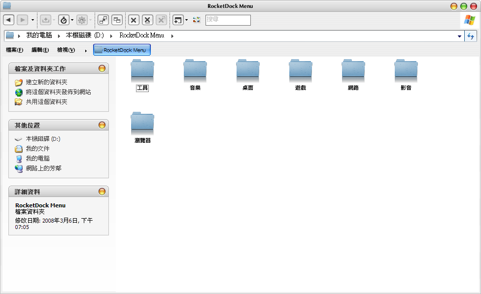 c. 先新增一個資料夾 (可自行命名,在此以 RocketDock Menu 為例),在 RocketDock Menu 下再依需要建立數個分類資料夾,再將所需要的捷徑分別放到特定分類資料夾。