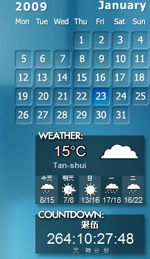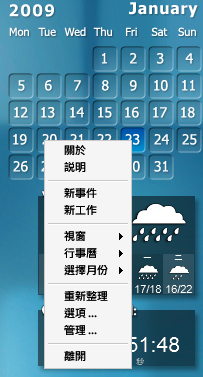 同樣的大家可以先參考這篇,但是在這要修正一項東西,就是在新版的 Rainlendar 中,已經可以完整的使用舊版的 Skin 了,所以舊版 Skin 的愛用者,可以更新成新版的來用用了,可以點這裡下載,新版也多了一些好用的功能,以下會針對我先在用的天氣還有倒數計時外掛來為新版 Rainlendar 作個簡單的介紹。