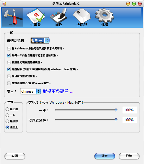 其實在功能使用上並不會和舊版的 Rainlandar 差太多,相差最多的地方大概就是選項以及可以新增一些外掛。