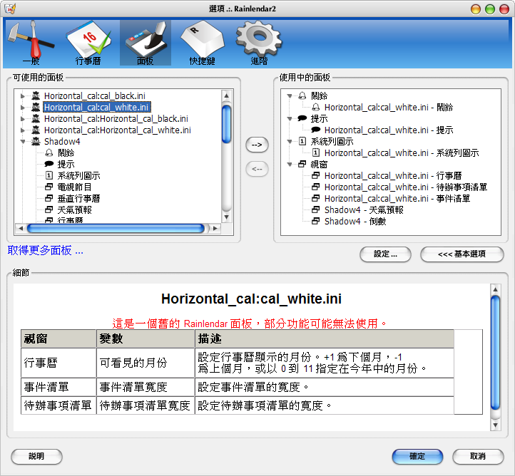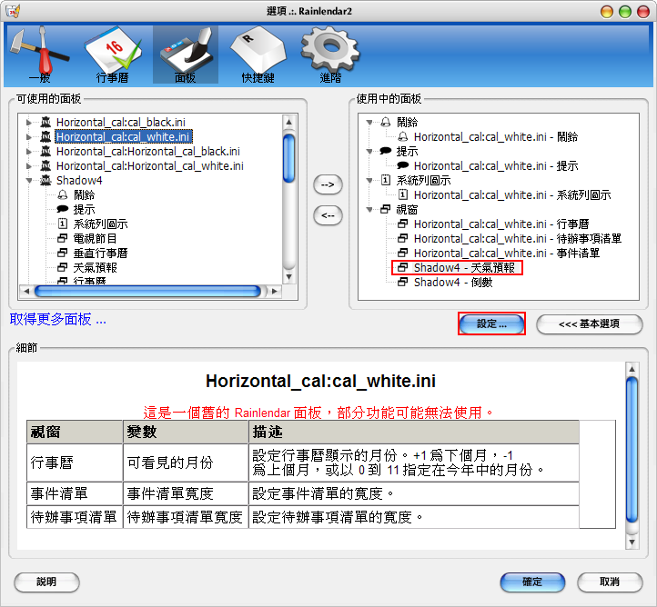 打開選項後,點到 "面板" 的大標籤,接著看到 "Shadow4" 可以打開,裡面就可以看到一些細項,接著先點選你要的項目,再點一下 "-->",就可以將該項功能加到你的面版,更換面板也是這種作法,只是舊版的面板的話要先丟到 "C:\Program Files\Rainlendar2\skins" 才看的到,而面板底下的功能其實都是獨立的,所以使用 Shoadow4 的套件並不一定要使用它的日曆面版,可自行搭配使用。