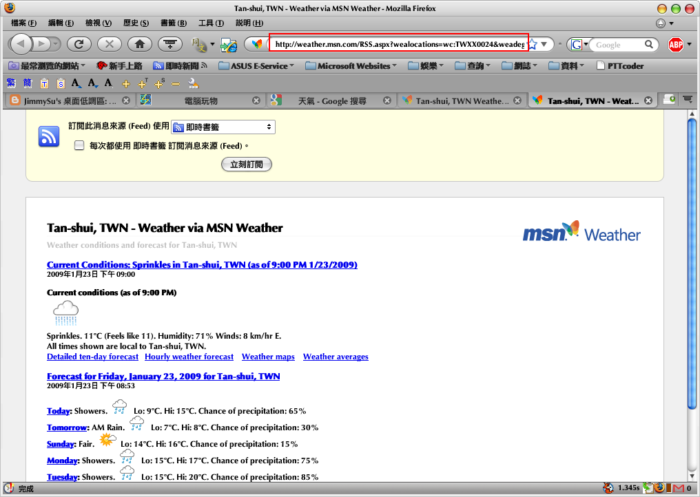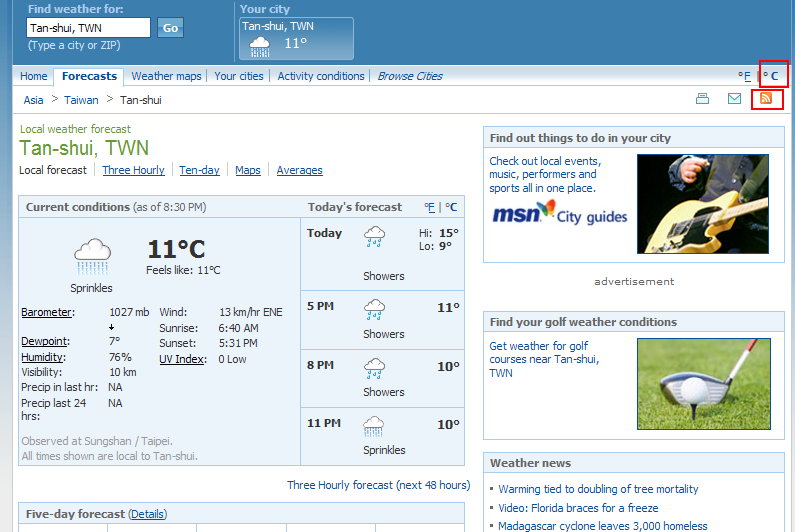 首先先點一下 "C" 讓所有資訊都變成攝氏溫度,接著點一下 RSS 的橘色符號,會進入以下頁面:
