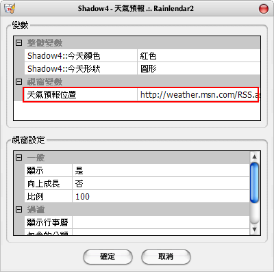 將此頁面的網址整串複製下來後,點一下 "Shadow 4-天氣預報",點一下設定,會跑出設定視窗,將剛剛複製的網址貼上去就可以啦,接著只要重整理一下 Rainlendar 就會跑出天氣資訊了。