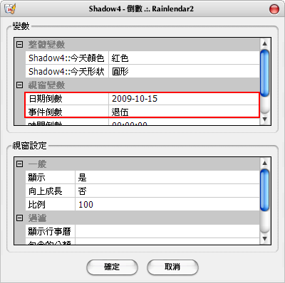 關於新版的 Rainlendar 功能,在這邊就先不詳述了,在這篇主要是要怎麼使用我用的天氣跟倒數計時外掛,廢話不多說,首先一樣先點這裡下載套件,同樣的也是連點兩下就自動安裝完成啦。所安裝的為本來 Rainlendar Shadow4 的擴充套件,除了上述的天氣跟倒數計時外,還有電視、相片等,相片似乎只能用網路上的相片,而且是隨機的相簿無法調整來源,電視也同樣無法調整,所以在這邊我只使用了天氣以及倒數計時的功能。
